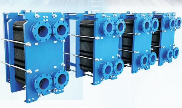 传热板上带有密封垫圈,密封垫圈形成流道,起到防止液体外泄的密封作用。传热板的数量和大小取决于介质的流量和流体的物理特性,压力降及进出口的温度条件。压紧板主要防止因流体压差可能会引起的板片变形。在组装传热板片(带有密封垫圈的板片)时,带有密封垫圈的板面朝向固定压紧板,并每张板片进行180°的旋转以形成流道。只沿A板流动液体始终在A板内流动;而只沿B板流动的液体则在每隔一块安装的B板内反方向流动。