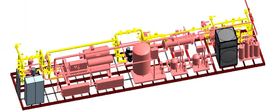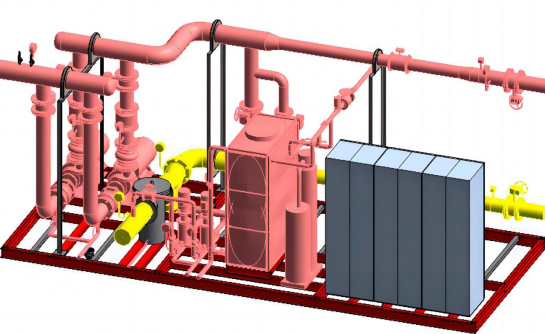 将主机,空调机房设备内的循环水泵,水路定压设备,压力表,温度计,各类阀门和电气控制系统.根据常规用户的冷热量需求,用户的外部管路系统特性参数(扬程),两侧外部管路系统特性选取空调主机,循环水泵及定压设备,同时选取通用的监测仪表温度计和压力表;同时在连接外部管道处安装配备阀门,包括冷热源侧和用户侧的进出水阀门,以及根据设计需要的其它的阀门.以上机房设备在工厂集成化生产安装在一个撬装上。